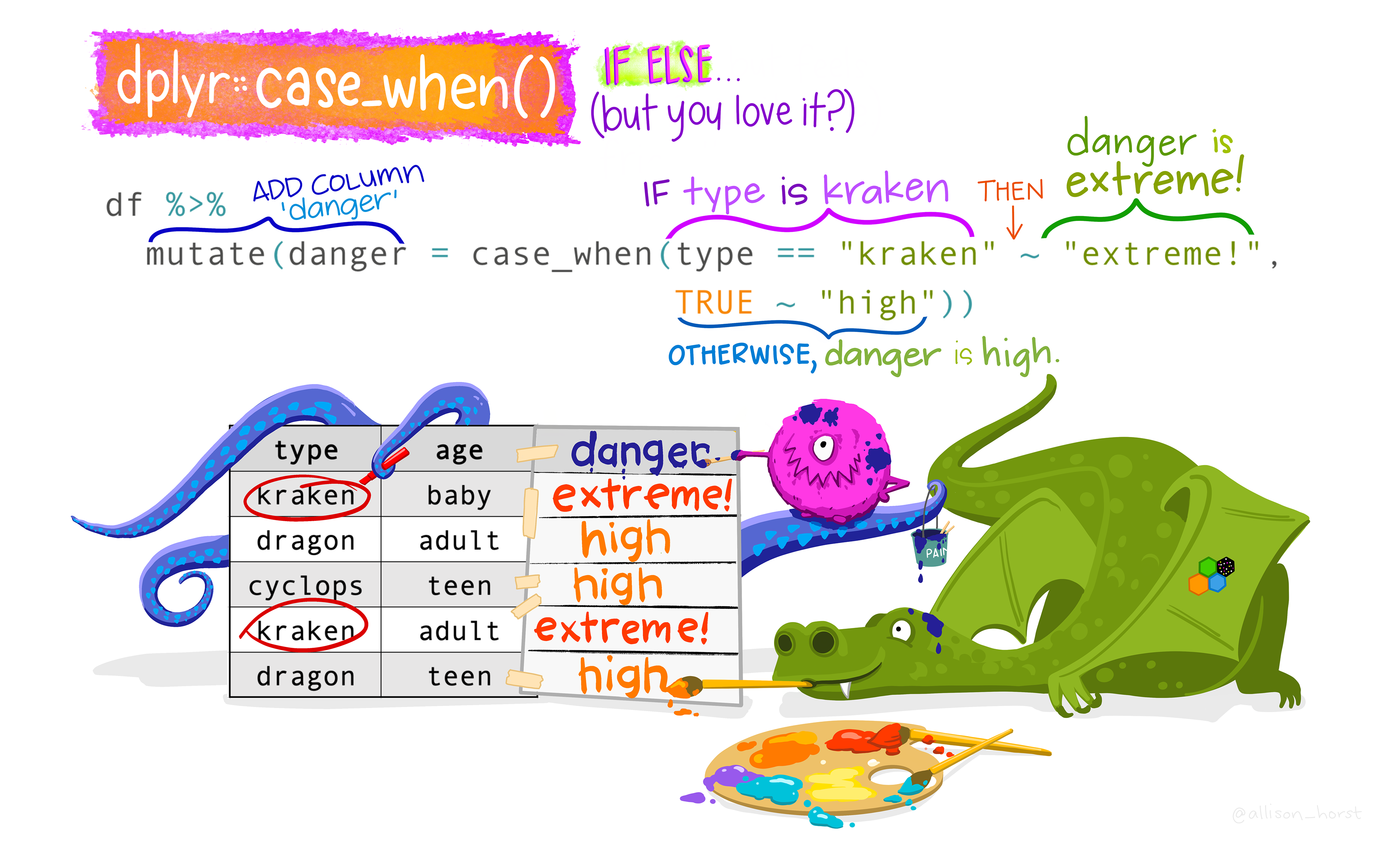 ifelse() function, which returns a value with the same shape as test which is filled with elements selected from either yes or no depending on whether the element of test is TRUE or FALSE.ifelse(condition, TRUE, FALSE), it can give you:See if you can use the logical operators to manipulate our penguins data using