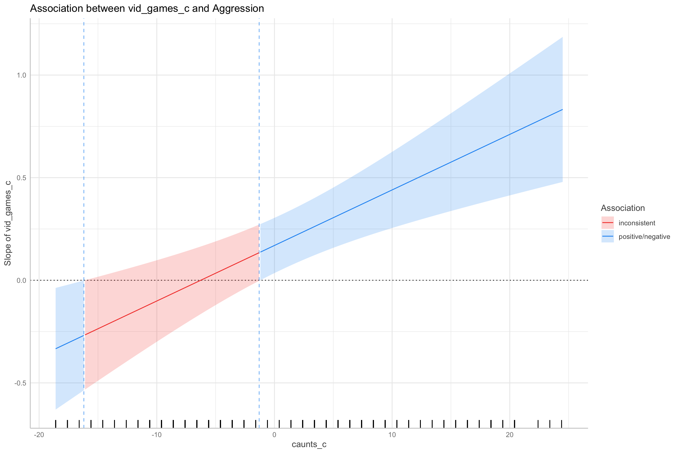 Since the moderator (callous traits) was continuous, we looked for the turning points for where exactly, in the value of the moderator, the effect of the independent variable (Hours) turns from non-significance to significance (for a pre-specified significance level of 0.05). This is done using the Johnson–Neyman technique. The Johnson–Neyman technique showed that at the association between hours played and aggression is positive for values higher than -1.30. Inside the interval of [-16.20, -1.30], there were no clear associations. There is a detrimental effect between hours played and aggression at high levels of callous traits.