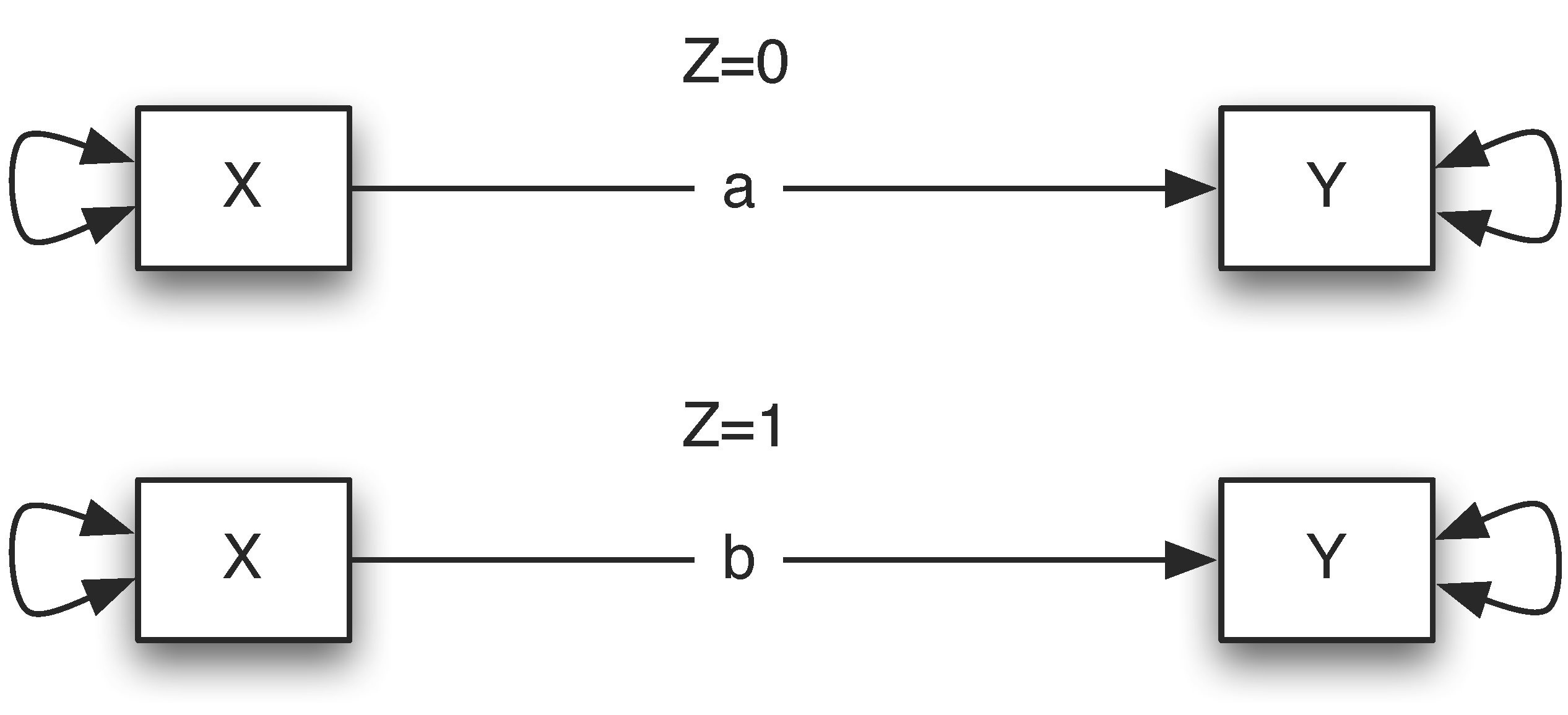 where ( \(X\) ) is a continuous predictor and ( \(Z\) ) is a dummy coded categorical predictor.