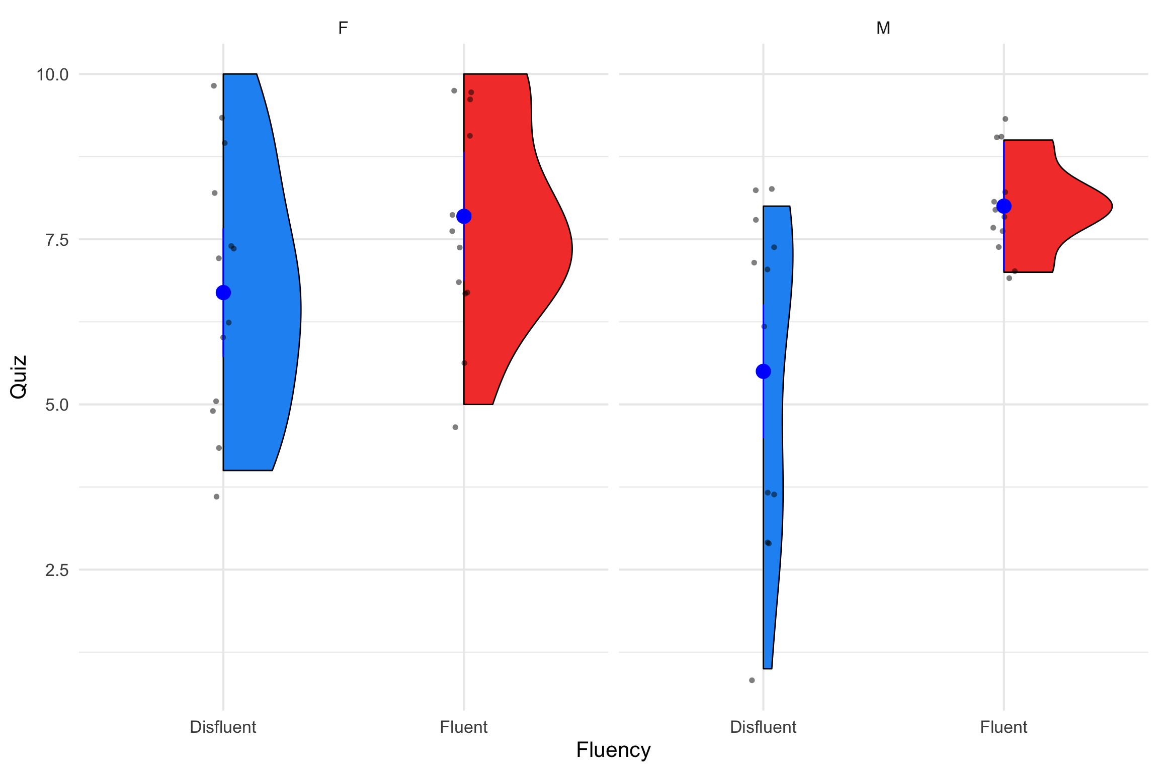 | Full/Alternative model: | `Quiz ~ Gender + Fluency + Gender:Fluency` |
