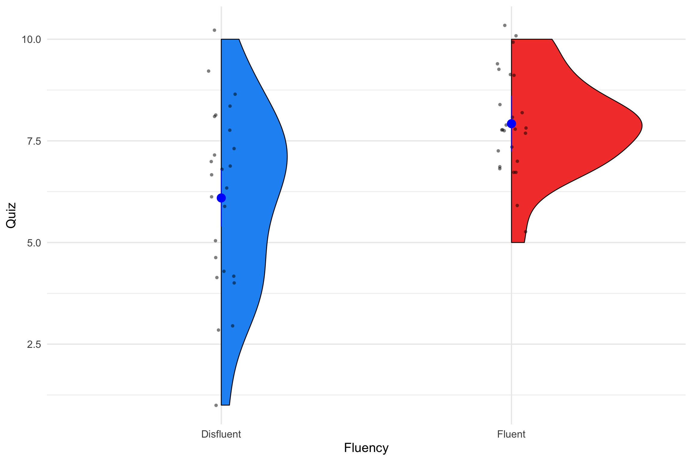 | Full/Alternative model: | `Quiz ~ Fluency + Gender` |